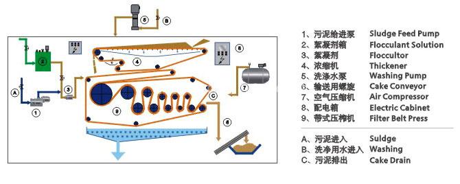 經(jīng)過(guò)濃縮的物料與一定濃度的絮凝劑在靜、動(dòng)態(tài)混合器中充分混合以后,污泥中的微小固體顆粒聚凝成體積較大的絮狀團(tuán)塊,同時(shí)分離出自由水,絮凝后的污泥被輸送到濃縮重力脫水的濾帶上,在重力的作用下自由水被分離,形成不流動(dòng)狀態(tài)的污泥,然后夾持在上下兩條網(wǎng)帶之間,經(jīng)過(guò)楔形預(yù)壓區(qū)、低壓區(qū)和高壓區(qū)由小到大的擠壓力、剪切力作用下,逐步擠壓污泥,以達(dá)到泥、水分離,形成濾餅排出。